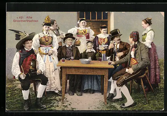 AK Feiernde Gesellschaft in alten Groednertrachten