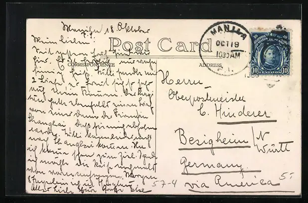Personenbezogene Daten auf der Rückseite der Karte wurden durch blauen Textmarker unkenntlich gemacht. Die blauen Stellen sind auf die Vorderseite durchgeweicht und wirken sich negativ auf das Postkartenfoto aus