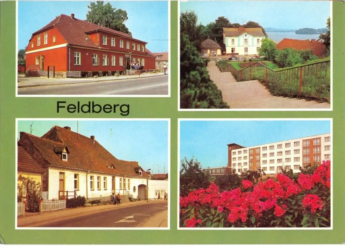 Ansichtskarte Feldberg Kr. Neustrelitz vier Abb. - Rathaus, FDGB-Heim "Freundschaft" (2), Apotheke in der Fürstenberger Str. Erhaltung I-II ungelaufen Druckvermerk: 1986 Herstellungsland: DDR Verlag: Bild und Heimat, Reichenbach i. V. - 01 03 0138/06