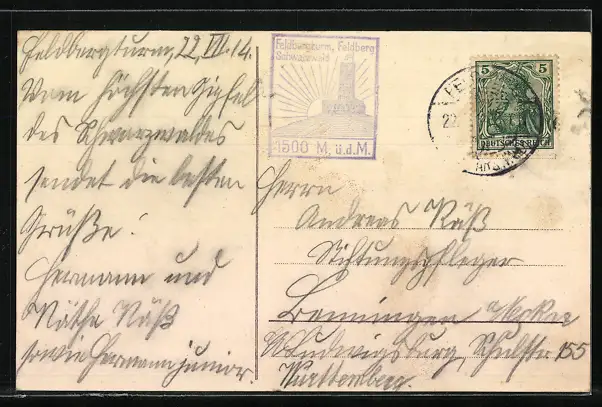 Personenbezogene Daten auf der Rückseite der Karte wurden durch blauen Textmarker unkenntlich gemacht. Die blauen Stellen sind auf die Vorderseite durchgeweicht und wirken sich negativ auf das Postkartenfoto aus