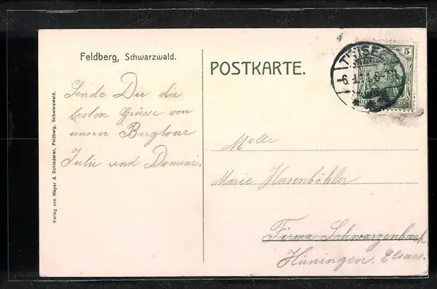 Personenbezogene Daten auf der Rückseite der Karte wurden durch blauen Textmarker unkenntlich gemacht. Die blauen Stellen sind auf die Vorderseite durchgeweicht und wirken sich negativ auf das Postkartenfoto aus