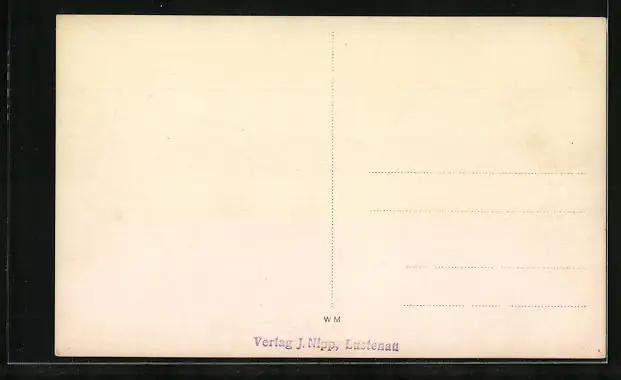 Personenbezogene Daten auf der Rückseite der Karte wurden durch blauen Textmarker unkenntlich gemacht. Die blauen Stellen sind auf die Vorderseite durchgeweicht und wirken sich negativ auf das Postkartenfoto aus