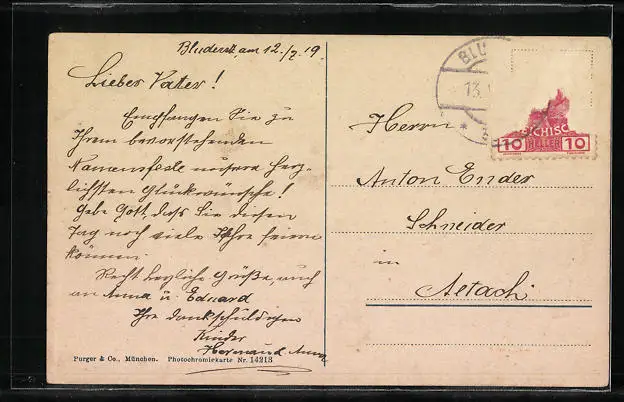 alte Ansichtskarte, gelaufen 1919, Briefmarke entfernt, rückseitig Oberflächenschaden, guter Zustand