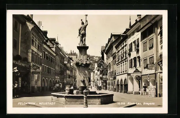 AK Feldkirch-Neustadt, Strassenpartie mit Geschäften und Brunnen