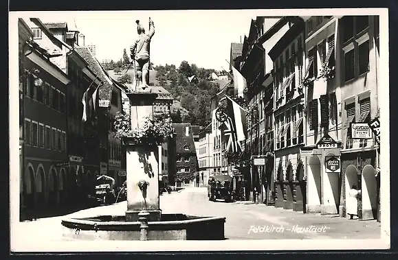AK Feldkirch-Neustadt, Strassenpartie mit Geschäften und Brunnen