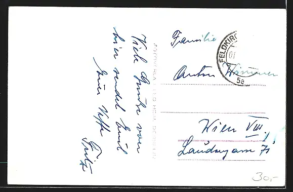 Personenbezogene Daten auf der Rückseite der Karte wurden durch blauen Textmarker unkenntlich gemacht. Die blauen Stellen sind auf die Vorderseite durchgeweicht und wirken sich negativ auf das Postkartenfoto aus