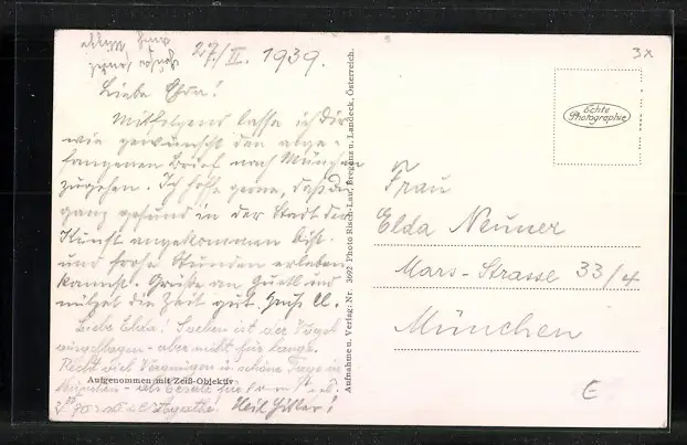 Personenbezogene Daten auf der Rückseite der Karte wurden durch blauen Textmarker unkenntlich gemacht. Die blauen Stellen sind auf die Vorderseite durchgeweicht und wirken sich negativ auf das Postkartenfoto aus