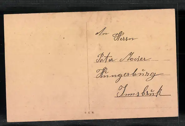 Personenbezogene Daten auf der Rückseite der Karte wurden durch blauen Textmarker unkenntlich gemacht. Die blauen Stellen sind auf die Vorderseite durchgeweicht und wirken sich negativ auf das Postkartenfoto aus