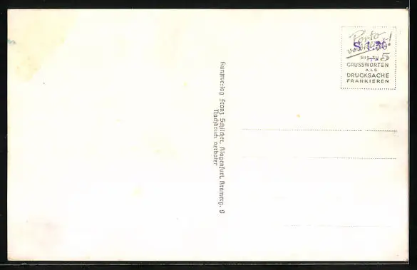 Personenbezogene Daten auf der Rückseite der Karte wurden durch blauen Textmarker unkenntlich gemacht. Die blauen Stellen sind auf die Vorderseite durchgeweicht und wirken sich negativ auf das Postkartenfoto aus