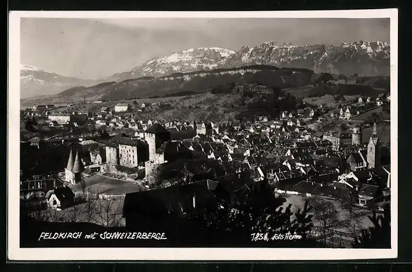 AK Feldkirch, Ortsansicht mit Schweizerberge