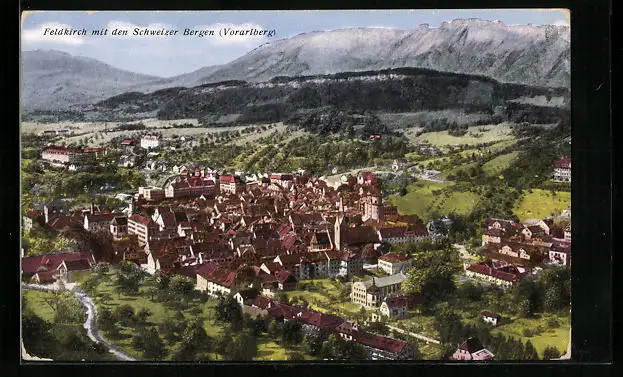 AK Feldkirch, Ortsansicht mit den Schweizer Bergen