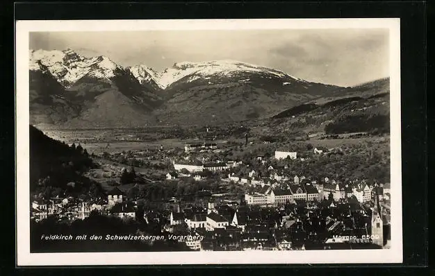 AK Feldkirch, Ortsansicht mit den Schweizerbergen