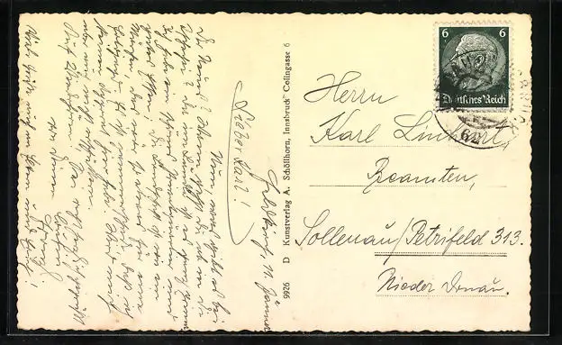Personenbezogene Daten auf der Rückseite der Karte wurden durch blauen Textmarker unkenntlich gemacht. Die blauen Stellen sind auf die Vorderseite durchgeweicht und wirken sich negativ auf das Postkartenfoto aus