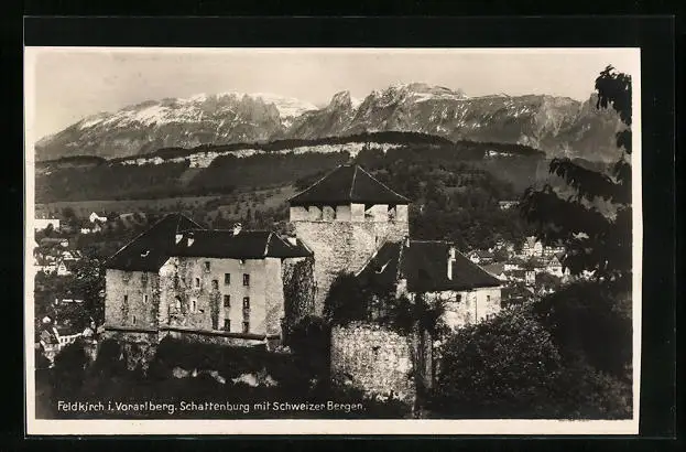AK Feldkirch, Schattenburg mit Schweizer Bergen