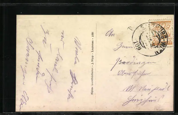 Personenbezogene Daten auf der Rückseite der Karte wurden durch blauen Textmarker unkenntlich gemacht. Die blauen Stellen sind auf die Vorderseite durchgeweicht und wirken sich negativ auf das Postkartenfoto aus