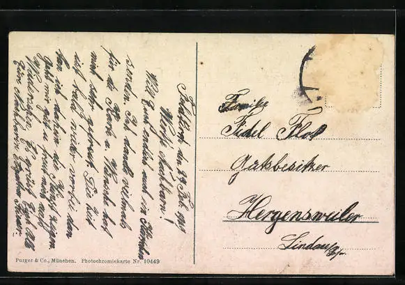 Personenbezogene Daten auf der Rückseite der Karte wurden durch blauen Textmarker unkenntlich gemacht. Die blauen Stellen sind auf die Vorderseite durchgeweicht und wirken sich negativ auf das Postkartenfoto aus