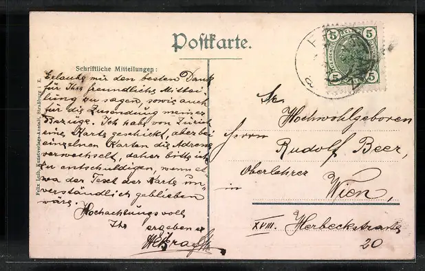 Personenbezogene Daten auf der Rückseite der Karte wurden durch blauen Textmarker unkenntlich gemacht. Die blauen Stellen sind auf die Vorderseite durchgeweicht und wirken sich negativ auf das Postkartenfoto aus