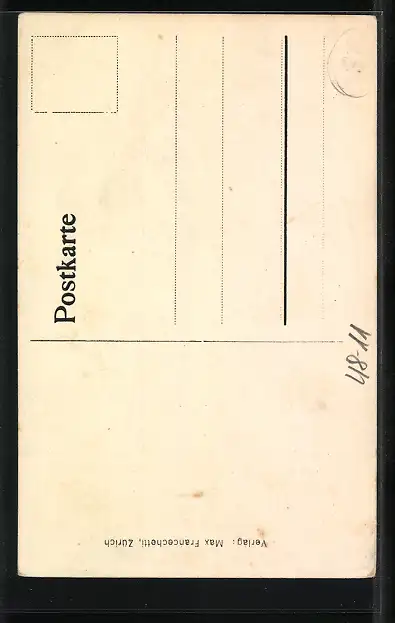 Personenbezogene Daten auf der Rückseite der Karte wurden durch blauen Textmarker unkenntlich gemacht. Die blauen Stellen sind auf die Vorderseite durchgeweicht und wirken sich negativ auf das Postkartenfoto aus