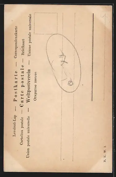 Personenbezogene Daten auf der Rückseite der Karte wurden durch blauen Textmarker unkenntlich gemacht. Die blauen Stellen sind auf die Vorderseite durchgeweicht und wirken sich negativ auf das Postkartenfoto aus