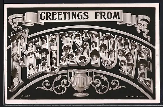 AK Felixstowe, Frauenportraits im Schriftzug-Passepartout