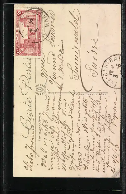 Personenbezogene Daten auf der Rückseite der Karte wurden durch blauen Textmarker unkenntlich gemacht. Die blauen Stellen sind auf die Vorderseite durchgeweicht und wirken sich negativ auf das Postkartenfoto aus