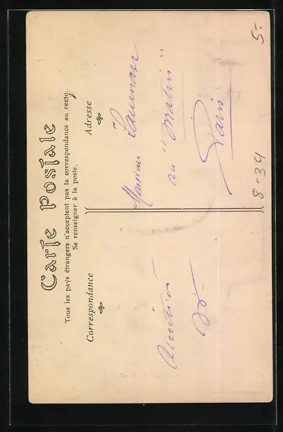 Personenbezogene Daten auf der Rückseite der Karte wurden durch blauen Textmarker unkenntlich gemacht. Die blauen Stellen sind auf die Vorderseite durchgeweicht und wirken sich negativ auf das Postkartenfoto aus