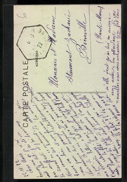 Personenbezogene Daten auf der Rückseite der Karte wurden durch blauen Textmarker unkenntlich gemacht. Die blauen Stellen sind auf die Vorderseite durchgeweicht und wirken sich negativ auf das Postkartenfoto aus