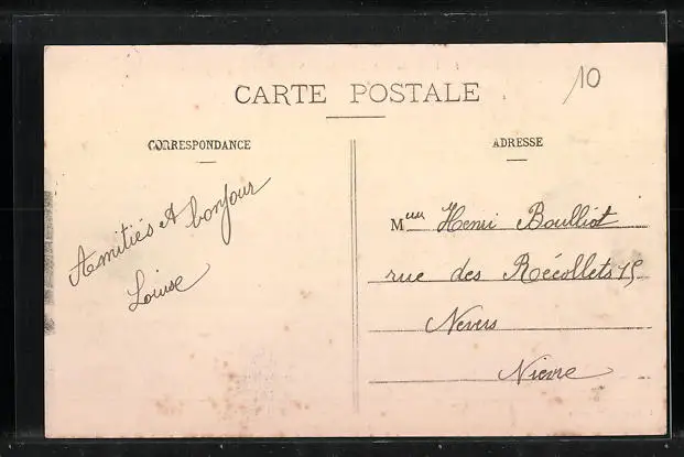 Personenbezogene Daten auf der Rückseite der Karte wurden durch blauen Textmarker unkenntlich gemacht. Die blauen Stellen sind auf die Vorderseite durchgeweicht und wirken sich negativ auf das Postkartenfoto aus