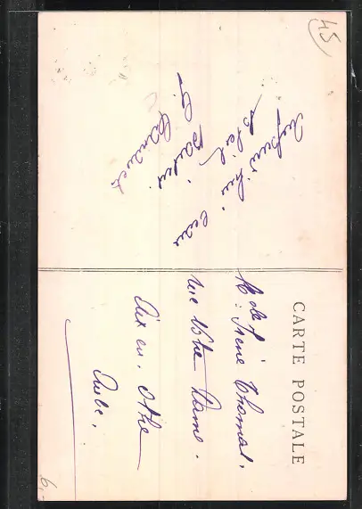 Personenbezogene Daten auf der Rückseite der Karte wurden durch blauen Textmarker unkenntlich gemacht. Die blauen Stellen sind auf die Vorderseite durchgeweicht und wirken sich negativ auf das Postkartenfoto aus