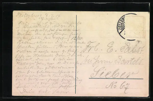 Personenbezogene Daten auf der Rückseite der Karte wurden durch blauen Textmarker unkenntlich gemacht. Die blauen Stellen sind auf die Vorderseite durchgeweicht und wirken sich negativ auf das Postkartenfoto aus