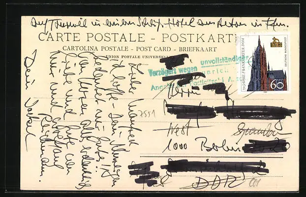 Personenbezogene Daten auf der Rückseite der Karte wurden durch blauen Textmarker unkenntlich gemacht. Die blauen Stellen sind auf die Vorderseite durchgeweicht und wirken sich negativ auf das Postkartenfoto aus