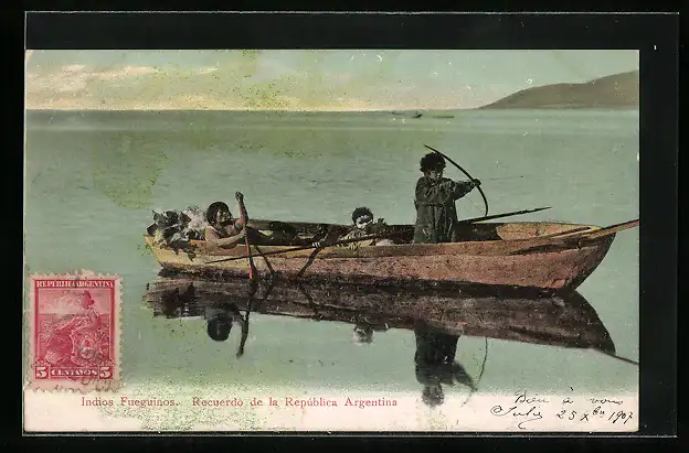 AK Feuerland, Indios Fueguinos, Indianer im Ruderboot