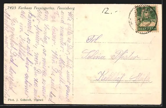 Personenbezogene Daten auf der Rückseite der Karte wurden durch blauen Textmarker unkenntlich gemacht. Die blauen Stellen sind auf die Vorderseite durchgeweicht und wirken sich negativ auf das Postkartenfoto aus