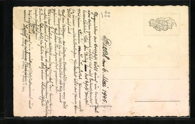 Personenbezogene Daten auf der Rückseite der Karte wurden durch blauen Textmarker unkenntlich gemacht. Die blauen Stellen sind auf die Vorderseite durchgeweicht und wirken sich negativ auf das Postkartenfoto aus