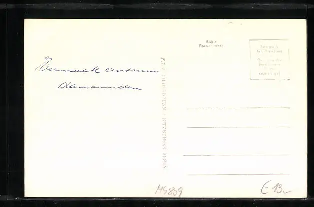 Personenbezogene Daten auf der Rückseite der Karte wurden durch blauen Textmarker unkenntlich gemacht. Die blauen Stellen sind auf die Vorderseite durchgeweicht und wirken sich negativ auf das Postkartenfoto aus