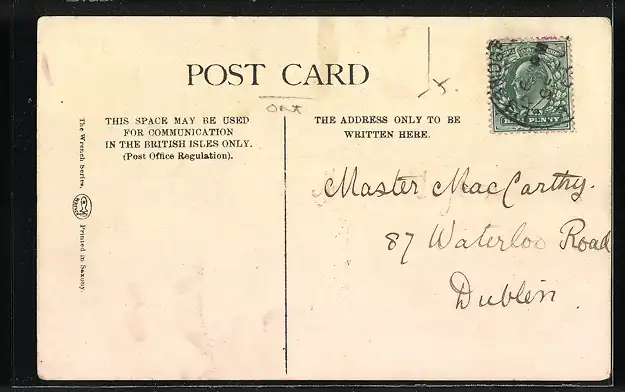 Personenbezogene Daten auf der Rückseite der Karte wurden durch blauen Textmarker unkenntlich gemacht. Die blauen Stellen sind auf die Vorderseite durchgeweicht und wirken sich negativ auf das Postkartenfoto aus