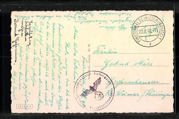 Personenbezogene Daten auf der Rückseite der Karte wurden durch blauen Textmarker unkenntlich gemacht. Die blauen Stellen sind auf die Vorderseite durchgeweicht und wirken sich negativ auf das Postkartenfoto aus