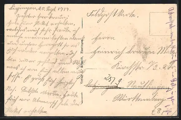 Personenbezogene Daten auf der Rückseite der Karte wurden durch blauen Textmarker unkenntlich gemacht. Die blauen Stellen sind auf die Vorderseite durchgeweicht und wirken sich negativ auf das Postkartenfoto aus