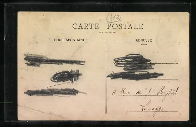 Personenbezogene Daten auf der Rückseite der Karte wurden durch blauen Textmarker unkenntlich gemacht. Die blauen Stellen sind auf die Vorderseite durchgeweicht und wirken sich negativ auf das Postkartenfoto aus