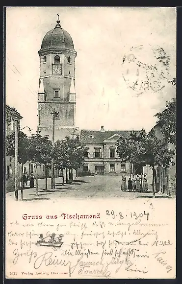 AK Fischamend, Blick zum Gasthof, Kirchturm
