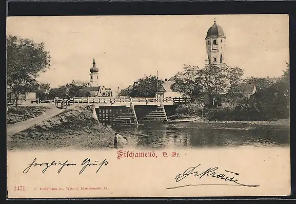 AK Fischamend, Flusspartie mit Brücke und Türmen