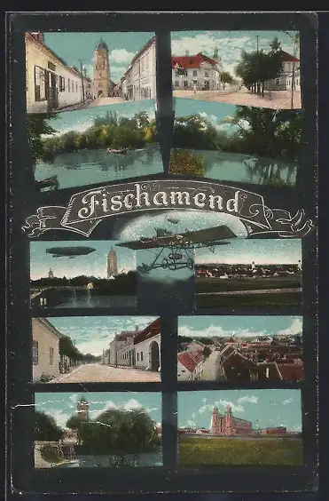 AK Fischamend, Kirche, Ansicht mit Zeppelin und Panorama