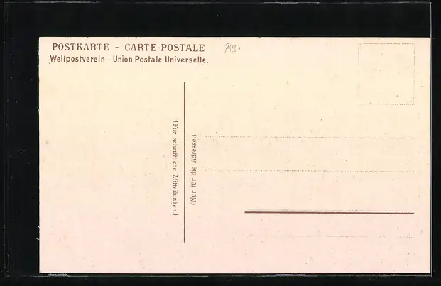 Personenbezogene Daten auf der Rückseite der Karte wurden durch blauen Textmarker unkenntlich gemacht. Die blauen Stellen sind auf die Vorderseite durchgeweicht und wirken sich negativ auf das Postkartenfoto aus