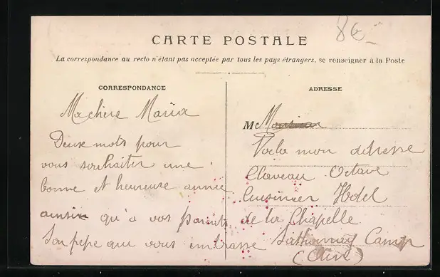Personenbezogene Daten auf der Rückseite der Karte wurden durch blauen Textmarker unkenntlich gemacht. Die blauen Stellen sind auf die Vorderseite durchgeweicht und wirken sich negativ auf das Postkartenfoto aus