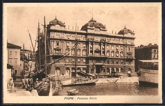 AK Fiume, Palazzo Adria mit Segelschiff