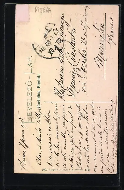 gelaufen 1908, Briefmarke entfernt, rückseitig Klebe- und Papierreste, guter Zustand