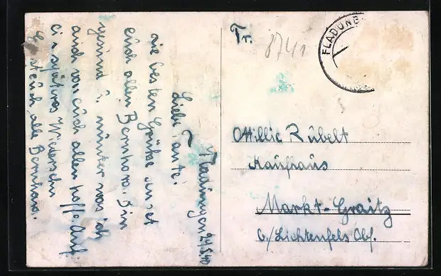 Personenbezogene Daten auf der Rückseite der Karte wurden durch blauen Textmarker unkenntlich gemacht. Die blauen Stellen sind auf die Vorderseite durchgeweicht und wirken sich negativ auf das Postkartenfoto aus