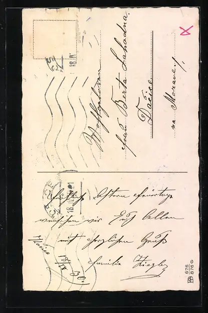 Personenbezogene Daten auf der Rückseite der Karte wurden durch blauen Textmarker unkenntlich gemacht. Die blauen Stellen sind auf die Vorderseite durchgeweicht und wirken sich negativ auf das Postkartenfoto aus