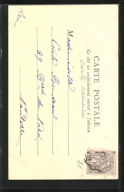Personenbezogene Daten auf der Rückseite der Karte wurden durch blauen Textmarker unkenntlich gemacht. Die blauen Stellen sind auf die Vorderseite durchgeweicht und wirken sich negativ auf das Postkartenfoto aus