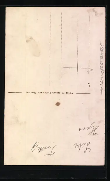 Personenbezogene Daten auf der Rückseite der Karte wurden durch blauen Textmarker unkenntlich gemacht. Die blauen Stellen sind auf die Vorderseite durchgeweicht und wirken sich negativ auf das Postkartenfoto aus